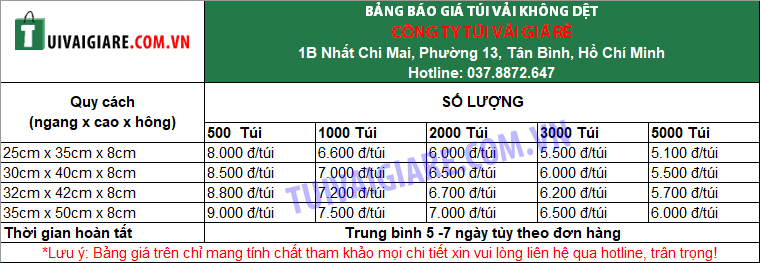 Dưới đây là bảng báo giá túi vải không dệt chuẩn, cạnh tranh trên thị trường: